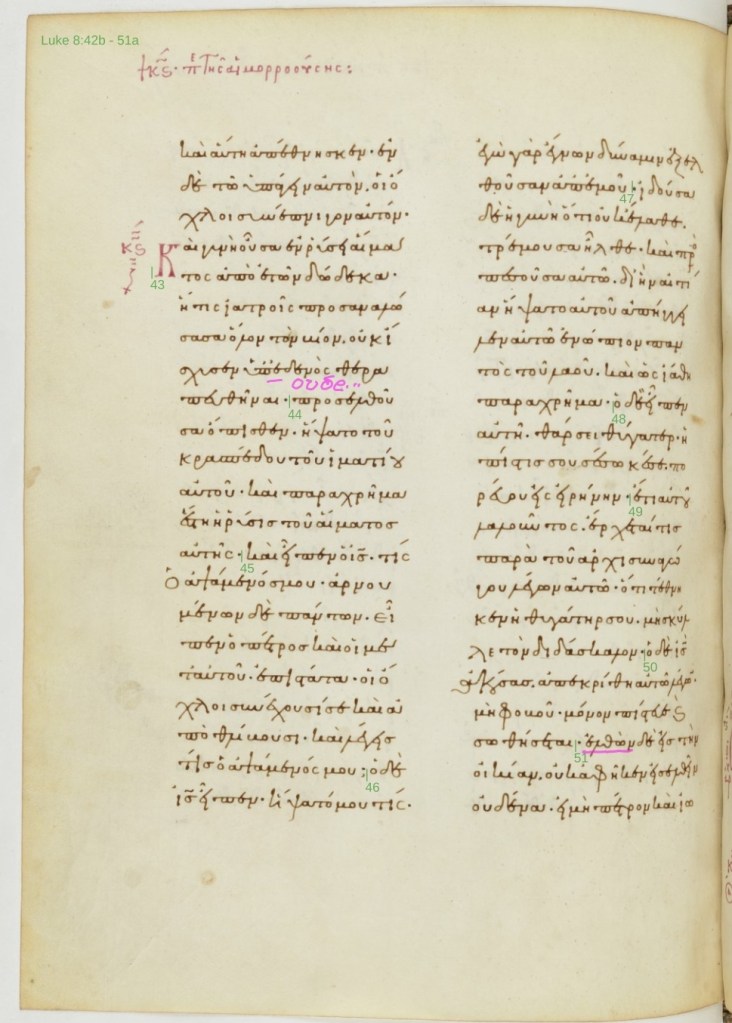 GA 8 is an 11th century, Byzantine miniscule that I’ve been reading to learn how to read Greek miniscules. 11th century Greek script is more difficult to decipher than earlier majuscules, at least the neat ones, a lot of the papyri are pretty tough to read. The Vatican has a brief description of miniscule writing in the miniscule bookhands section of their Greek Paleography page that helps to get started with miniscules. I like GA 8 because it’s fairly early for miniscule texts, it’s neatly written, and it is in good condition. I muddle through a few verses at a time and mark it up in my ebook reader, usually just marking the beginning of each verse, but sometimes marking interesting variant.